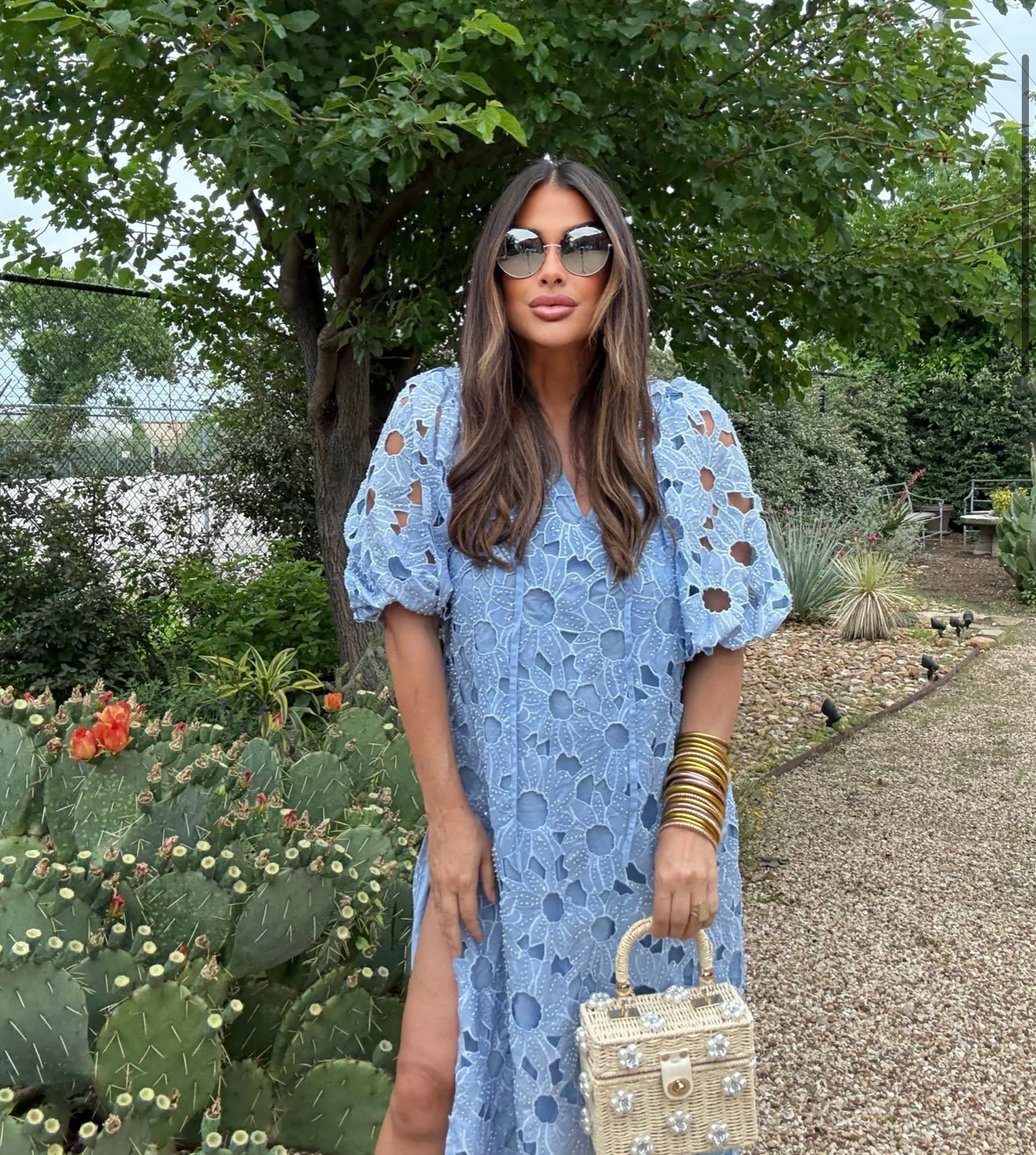 This dress fits true to size. The relaxed fit accommodates most bust sizes. 100% polyester.