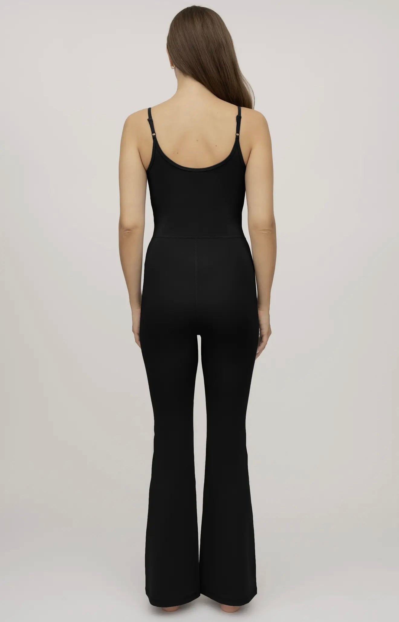 Ribbed Flare Jumpsuit-black with removable inner bra and adjustable straps. Has an open back and made with 78% polyester & 22% spandex